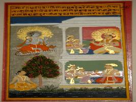 | Description / विवरण | Miniature painting based on Sarangadhar. king Raghu is depicted with his three beloved sons who are like the three eyes of Shiv. Shiv also is depicted, sitting on a tiger skin. |