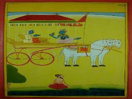 | Description / विवरण | Miniature painting based on Shri Bhagwat Gita. It depicts Krishna preaching Arjun, the lower part of the painting also depicts one sage meditating near the bank of river. |