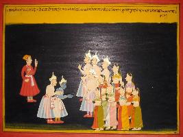 | Description / विवरण | Miniature painting based on Mahabharat - Ashwamegh parva depicting Pandavas touching feet of Krishna. Subhadra is touching feet of Draupadi and Krishna touches feet of Kunti. |