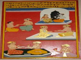 | Description / विवरण | Miniature painting based on Sarangadhar depicting Shiv and Parvati in upper part of the painting. In the lower part, Brahmans and priests are depicted performing their activities. |