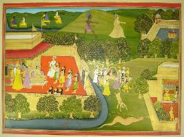 | Description / विवरण | Miniature painting based on Bhagwat Puran depicting the story of king Parikshit and Sukhdev muni depicting Sukhdev muni is shown talking to king Parikshit and narrating a story. At upper right part Indra got curse for Brahmhatya and for regret, he went to different tirth. In place of him, Raja Nahuk become king. Because of his wrong intention towards Indrani, he become python by the curse of Indra. This story is depicted all over painting. |