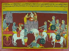 | Description / विवरण | Miniature painting based on Mahabharat - Ashwamegh parva depicting Nandi flows away Saurath s head in Prayaga and Garuda is telling all event to Krishna. Later king Hansadhwaja comes to Krishna and Krishna asks him to stop mourning for his son and later king touches his feet. |
