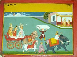 | Description / विवरण | Miniature painting based on Krishna avatar charit depicting scenes of Devki Vasudev marriage ceremony. In the upper left side Devki and Vasudev are seen in palatial balcony. On the other part Kansa is trying to kill his sister Devki after hearing the Akashwani that her 8th son will kill him. |