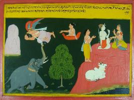 | Description / विवरण | Miniature painting based on Mahabharat - Ashwamegh parva depicting Garuda fighting fiercely with Nandi. |