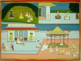 | Description / विवरण | Miniature painting based on Bhagwat Puran depicting the story of king Parikshit and Sukhdev muni depicting Sukhdev is shown sitting on couch and talking to king Parikshit and other men at upper right part. At the upper left part. Man is shown talking to women in a palace. At lower panel, women is shown worshipping lord Vishnu. At the lower right part, man is giving aim to Brahman. A yagna is being performed by Brahman and men is giving food to Brahman. |
