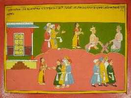 | Description / विवरण | Miniature painting based on Mahabharat - Vana parva depicting a story of Raja Nal on the upper part Nal is depicted playing chaupar with a king, then some people come to Damayanti to ask her to stop nal from playing the chaupar but Nal does not listen to her and peoples returns back. |