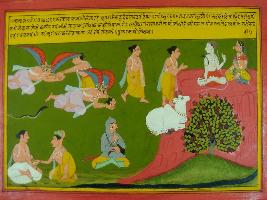 | Description / विवरण | Miniature painting based on Mahabharat - Ashwamegh parva depicting Garuda is taking Saurath s head and saw Shiv-Parvati on way, then he talks to them and Shiv ask Nandi to take the head of Saurath. |