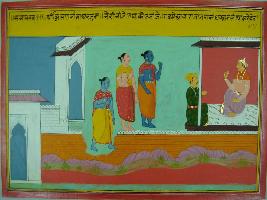| Description / विवरण | Miniature painting based on Mahabharat - Sabha parva depicting Krishna, Bhim and Arjun coming to Jarasandha s palace and Jarasandha depicted sitting on throne. |