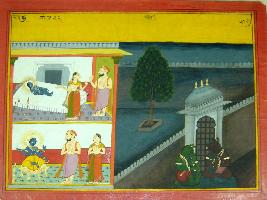 | Description / विवरण | Miniature painting based on Krishna avatar charit depicting the scenes of Krishna birth in the prison of Kansa. In the lower right side Vishnu is depicted and asking Vasudev to bring the child Krishna to Nand s home. In the left side two demon guards are seen sleeping. |