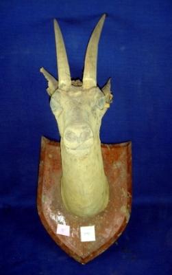 | Description / विवरण | Head of a deer with two horns. Hair are missing from many places. It is preserved with taxidermy technique. |