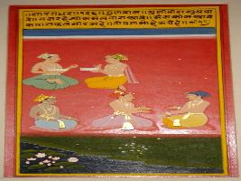 | Description / विवरण | Miniature painting based on Sarangadhar, on the upper part two men are depicted holding a granth, and on the lower part three men are depicted sitting. |