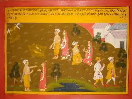 | Description / विवरण | Miniature painting based on Mahabharat - Vana parva depicting Nala is moving with Damayanti in forest and saw a pair of bird struck in net. The they flow away taking the het with the help of each other. After seeing this, Nala said to Damayanti that we will always line together like there birds and will help and support each other and will solve our problem. |