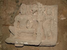 | Description / विवरण | It is a goddess shown seated in lalitasana on a lotus. The four armed goddess is shown holding something and rest three arms are broken. She is flanked by a padamasana. |