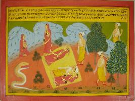 | Description / विवरण | Miniature painting based on Mahabharat - Vana parva depicting the story of Nal and Damyanti. This paintings depicts that Nal and Damyanti are sleeping in the forest and Nal go away by leaving Damyanti in the forest. |