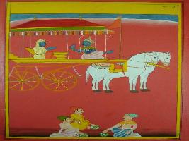 | Description / विवरण | Miniature painting based on Shri Bhagwat Gita. It depicts Krishna preaching Arjun, the lower part of the painting also depicts three kings are sitting together and having food. |