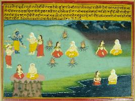 | Description / विवरण | Miniature painting based on Krishna charit, it is story how Devki and his husband performed penance in early birth to have Krishna as their child. They first worshipped be keeping their nose closed, then in water, then in rain, and at last surrounded by fire, ultimately Vishnu gave darshan to Devki and his husband. |