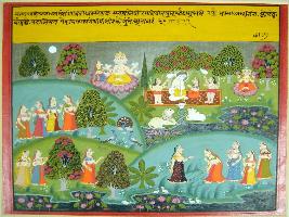 | Description / विवरण | Miniature painting based on Krishna avatar charit. In this painting, Lord Brahma has been depicted on the top with goddess Lakshmi. It is a scene from Vrindavan where gopis looking restless Krishna, some even looking to his footprint to fired him. |