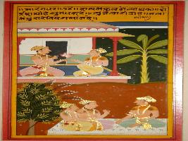 | Description / विवरण | Miniature painting based on Sarangadhar depicting two seated men, one is holding a lotus flower. In the lower part of the painting three men are talking in sitting position. |