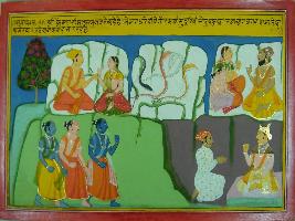 | Description / विवरण | Miniature painting based on Mahabharat - Sabha parva depicting Krishna talking to Bhim and Arjun about Gautama sage and Mahanagar of Anga banga. |