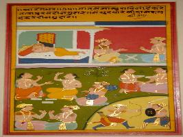 | Description / विवरण | Miniature painting based on Sarangadhar depicting two persons playing chaupar, while a man is sleeping in the upper portion of the painting. In the lower part men are receiving knowledge and fighting skills. |