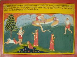 | Description / विवरण | Miniature painting based on Mahabharat - Vana parva depicting Damayanti is crying and shouting by seeing a python and a hunter is coming and helping her by killing the python. Then Damayanti give her introduction by hearing which the hunter become lusty. Then Damayanti cursed him and move forward. |