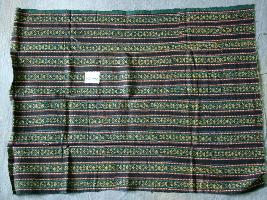 | Description / विवरण | This small cut-piece of some larger cotton cloth called rezi is intricately printed by black lines alternating with yellow and black creepers separated by red lines vertically has green ground. |