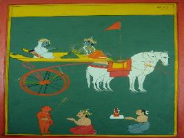 | Description / विवरण | Miniature painting based on Shri Bhagwat Gita. It depicts Krishna preaching Arjun, in the lower part of the painting depict one king is folding is hand in front of a demon who is holding a tridents and one lady is performing puja is front of a Shiv linga. |