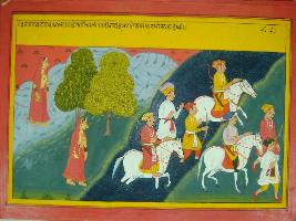 | Description / विवरण | Miniature painting based on Mahabharat - Vana parva. The painting depicts the story of Nal and Damayanti where Damayanti is seen in right side and some nobles are seen who are crossing a river. |