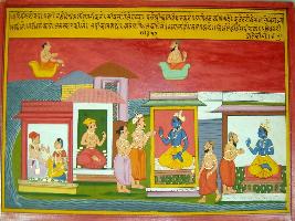 | Description / विवरण | Miniature painting based on Harivansha depicting Vishwakarma building the Dwarika Nagari. The writing on top describes that after that Krishna asks Kubera to give money and Kubera gives money to all. |