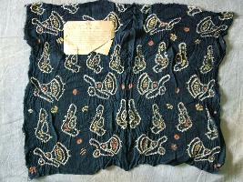 | Description / विवरण | This small piece of larger cloth is printed with small flowers of golden colours in booti manner on black ground. |