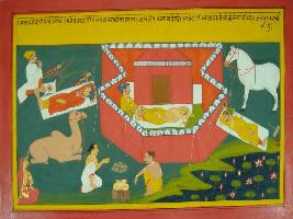 | Description / विवरण | Miniature painting based on Mahabharat - Vana parva. The painting so depicts that the people are resting and preparing meal with whom Damayanti is coming to find out Nal. |