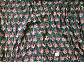| Description / विवरण | This cut-piece part of some large cotton cloth is printed with white and red flowers with green leaves, each having two. The main ground is of black colour. |