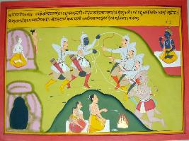 | Description / विवरण | Miniature painting based on Harivansha depicting a battle scene. In the right up corner a priest is seen, while Krishna is seen on the left up corner. In the bottom a man is performing a yagna followed by two women. |