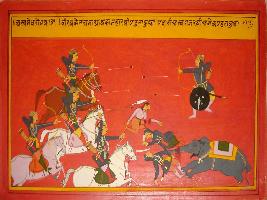 | Description / विवरण | Miniature painting based on Mahabharat - Ashwamegh parva depicting the Mahavat of elephant has died and many horse rider are trying to control the furious elephant. |
