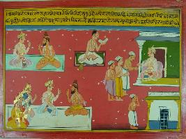 | Description / विवरण | Miniature painting based on Mahabharat - Ashwamegh parva depicting Janmejaya asking Jaimini sage about the king who performs yagna and left it in middle. Then he ask Vyas for the way to get rid of Gotra hatya. |