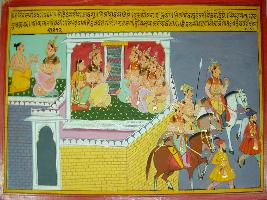 | Description / विवरण | Miniature painting based on Harivansha depicting Shishupal with his son seated. In the middle top king Shishupal and Rupmani seated and addressing to princes. king Jarasena along with army is campaigning towards Vidabha. |