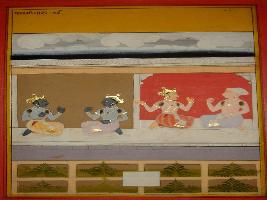| Description / विवरण | Miniature painting based on Shri Bhagwat Gita. It depicts on the upper right Arjun and Krishna in conversation and on the upper left Yudhisthir is talking to Dhritrashtra. |