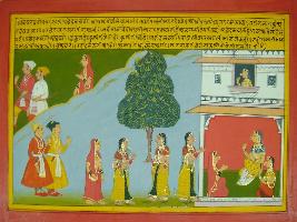 | Description / विवरण | Miniature painting based on Mahabharat - Vana parva. The painting depicts that Damayanti is travelling with two kumers and finally they reached in a Nagar, where the Rajmata of that kingdom asked about Damayanti s identify. And Damayanti tells about the sadness story of her life. |