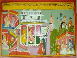 | Description / विवरण | Miniature painting based on Harivansha depicting scenes in which king Rukami seated with his attendant and busy in talking. Scenes are dominant of palace and army tents, in left top king Rukami getting blessing from Krishna. |