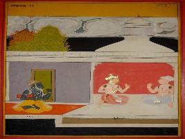 | Description / विवरण | Miniature painting based on Shri Bhagwat Gita. It depicts at the right side Sukmuni is seated posture and at the left side Yudhisthir and Dhritrashtra are in conversation. |