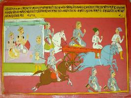 | Description / विवरण | Miniature painting based on Harivansha depicting in the upper right corner a messenger informing Rukmak regarding the eloping of Rukmani with Krishna. On the left side of painting Rukmak along with his army marching against Krishna. |