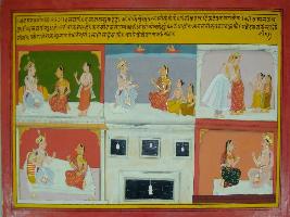 | Description / विवरण | Miniature painting based on Mahabharat - Vana parva depicting story of Nal-Damyanti. Nal and Damyanti are shown sitting and talking in the painting. They heard Akashwani in the middle of their talk. |