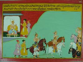 | Description / विवरण | Miniature painting based on Mahabharat - Ashwamegh parva depicting messenger is coming to king Jambanaswa and tells him that people take away the sacrificial horse. Then he moved ahead with his son. |