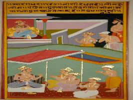| Description / विवरण | Miniature painting based on Sarangadhar depicting a king sitting inside a palace and nobles are standing outside the gate at upper panel. The king is shown sitting and talking to the nobles in the lower part. |