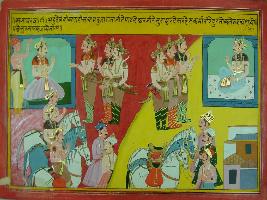 | Description / विवरण | Miniature painting based on Mahabharat - Sabha parva depicting Sahdev defeating king Amtuja, king Datleshwar and moves to Saurastra and send a messenger to Rukmani to meet her. |