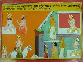 | Description / विवरण | Miniature painting based on Mahabharat - Sabha parva depicting Janmejaya is asking Vaispayana why Igni support Neel. then Vaispayana replied that one day Igni roaming in the disguise of a Brahman and when king Neel saw him he pays him namaskar then Igni satisfied and gave him boon. |