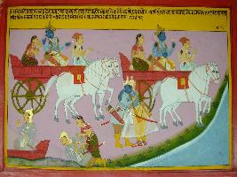 | Description / विवरण | Miniature painting based on Harivansha depicting elopement of Rukmani with folded hands and requesting Krishna not to kill his brother at top right part. At the lower right part Rukmani is shown helping Rukmak to get up and Krishna embracing him. At the top left Krishna is leaving with Rukmani. |