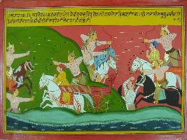 | Description / विवरण | Miniature painting based on Mahabharat - Sabha parva depicting Sahdev defeated Bindu and Anubindu near the bank of river Narmada and come to Mahikmati, where he fight with king Neel. A vigorous battle took place between king Neel and Sahdev. |