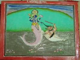 | Description / विवरण | Miniature painting depicting the Matasya avatar the first incarnation of Vishnu. Vishnu took the form of Matasya during the time of Pralaya and protected the human life which was in the form of seed. He protected Manu and continued the human life on earth. Vishnu is depicted coming out of the mouth of fish and killing the demon. |