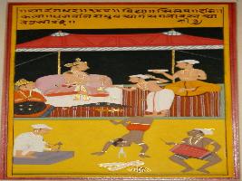 | Description / विवरण | Miniature painting based on Sarangadhar depicting giving alms to a Brahman at the upper panel. At the lower part, a Sculptor, Nat and a man playing musical instrument are depicted. |